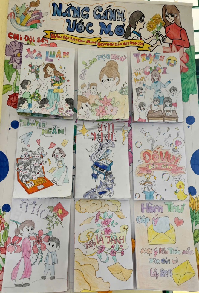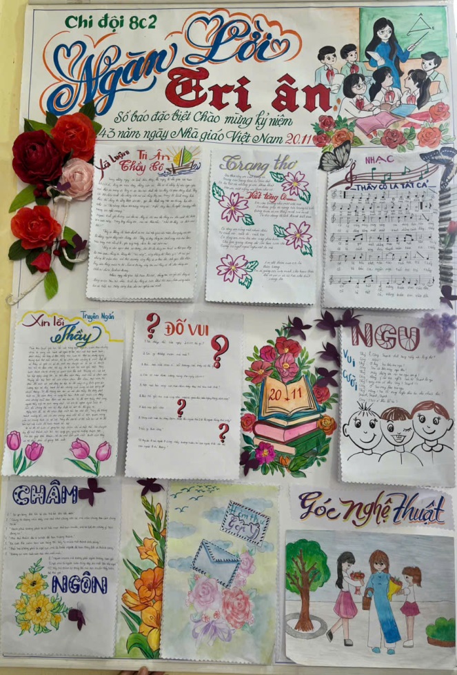 Hoạt động Trải nghiệm được tổ chức theo từng khối lớp: Học sinh các khối lớp đã phát huy tối đa sự sáng tạo và khéo léo của mình thông qua các tiết mục văn nghệ thú vị và làm báo tường đầy màu sắc. Đây là dịp để các em bộc lộ tình cảm, sự kính trọng và gửi gắm những lời chúc tốt đẹp nhất đến thầy cô.