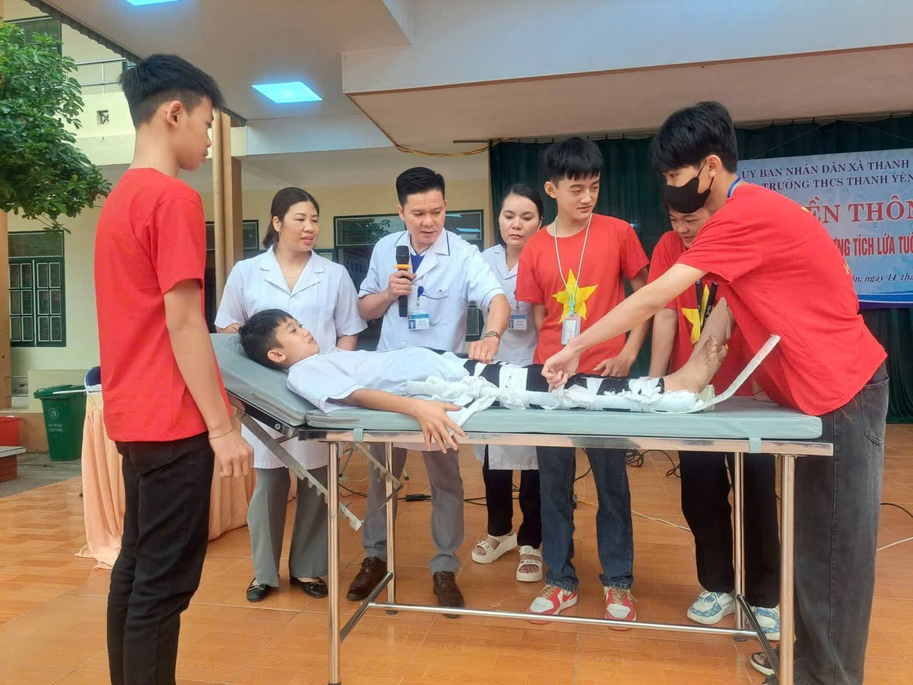 | Trạm y tế xã cùng cô Nguyễn Thị Thanh Hoa – Nhân viên y tế trường Hướng dẫn học sinh sơ cứu cho người bị gãy xương |