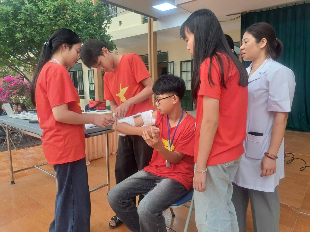 | Học sinh nhà trường thực hành kỹ năng băng bó cho bạn bị gãy xương |